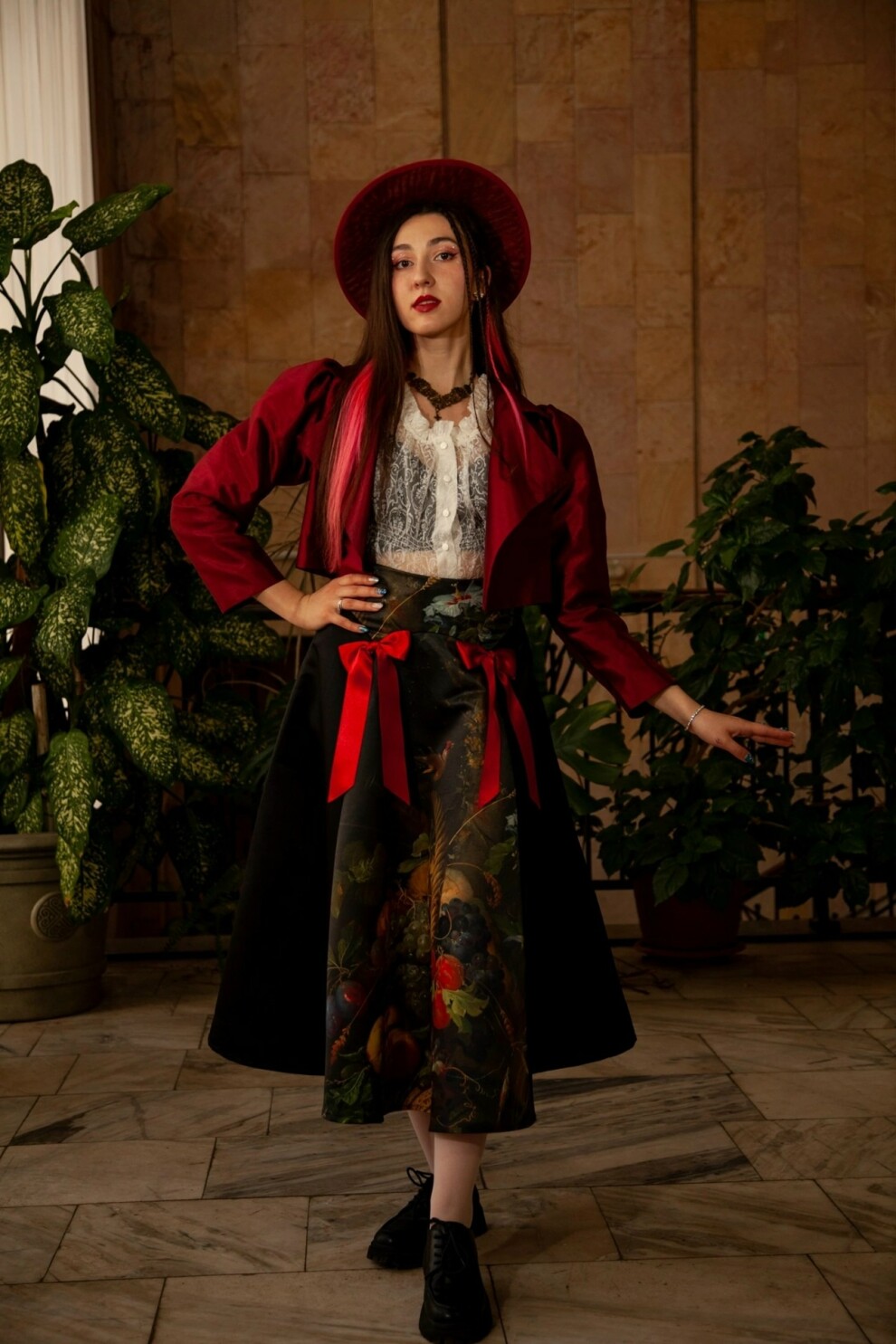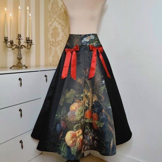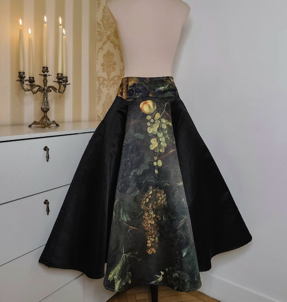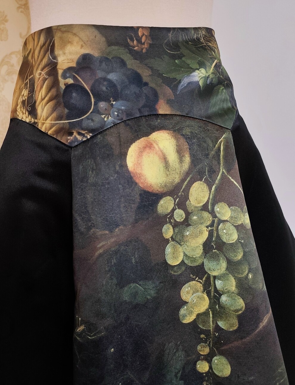 The designer's trick lies in the skillful placement of the print on all four elements: the front and back of the waistband and the front and back of the central gore of the skirt. By using different, non-repeating, but perfectly coordinated elements of the paintings on the front and back of the skirt, the designer created an elegant and simple design that appears captivating upon closer inspection.