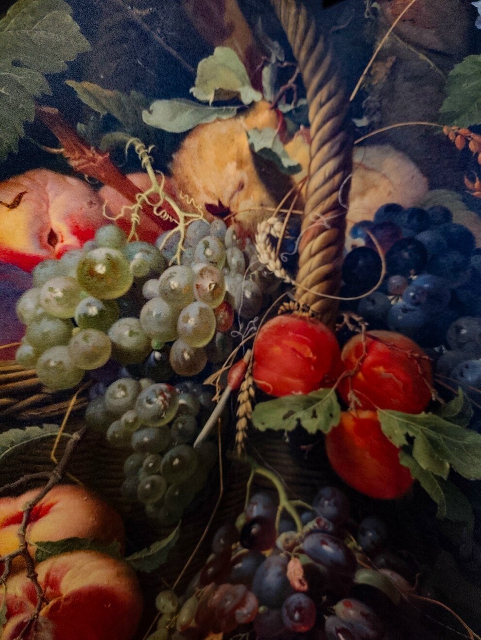 The central accent is a panel printed with an artist's still life: juicy fruits, grapes, peaches, and plums in abundance, flowers, and a basket.