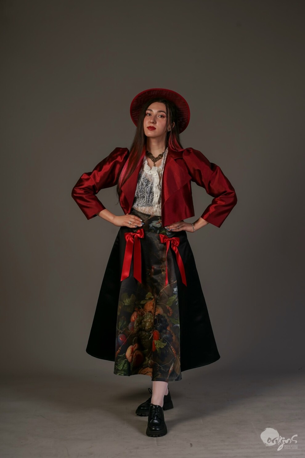 The "Augustina" skirt from the "Forever May You Reign" collection is crafted from a dense, shape-holding fabric with a wide flare that gracefully flows with movement. The gore cut allows the skirt to be worn without a petticoat for everyday wear.