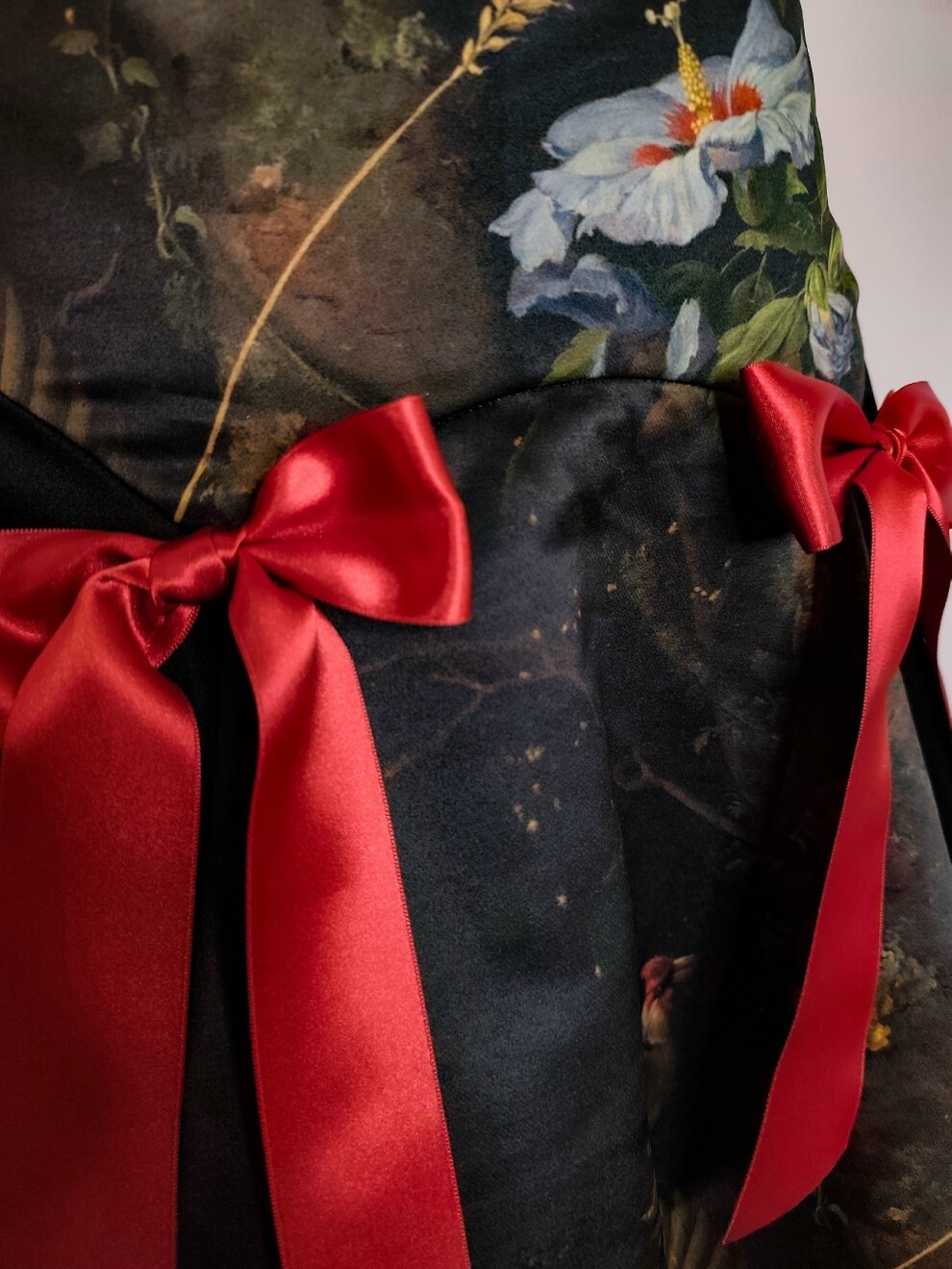 Contrasting scarlet satin ribbons at the waist emphasize femininity and add a festive touch.Ribbon bows are pinned and easily detachable.