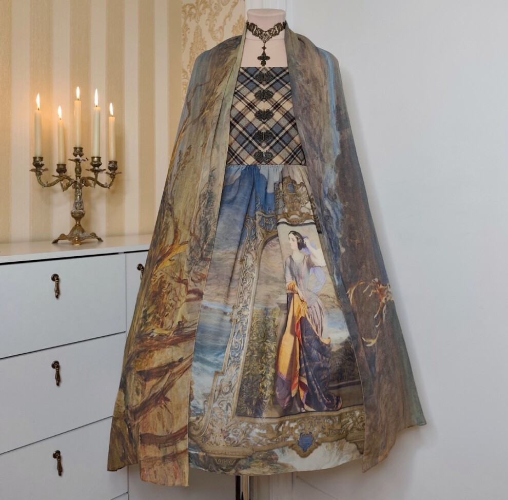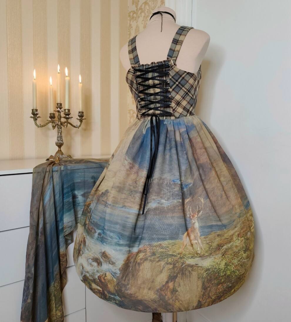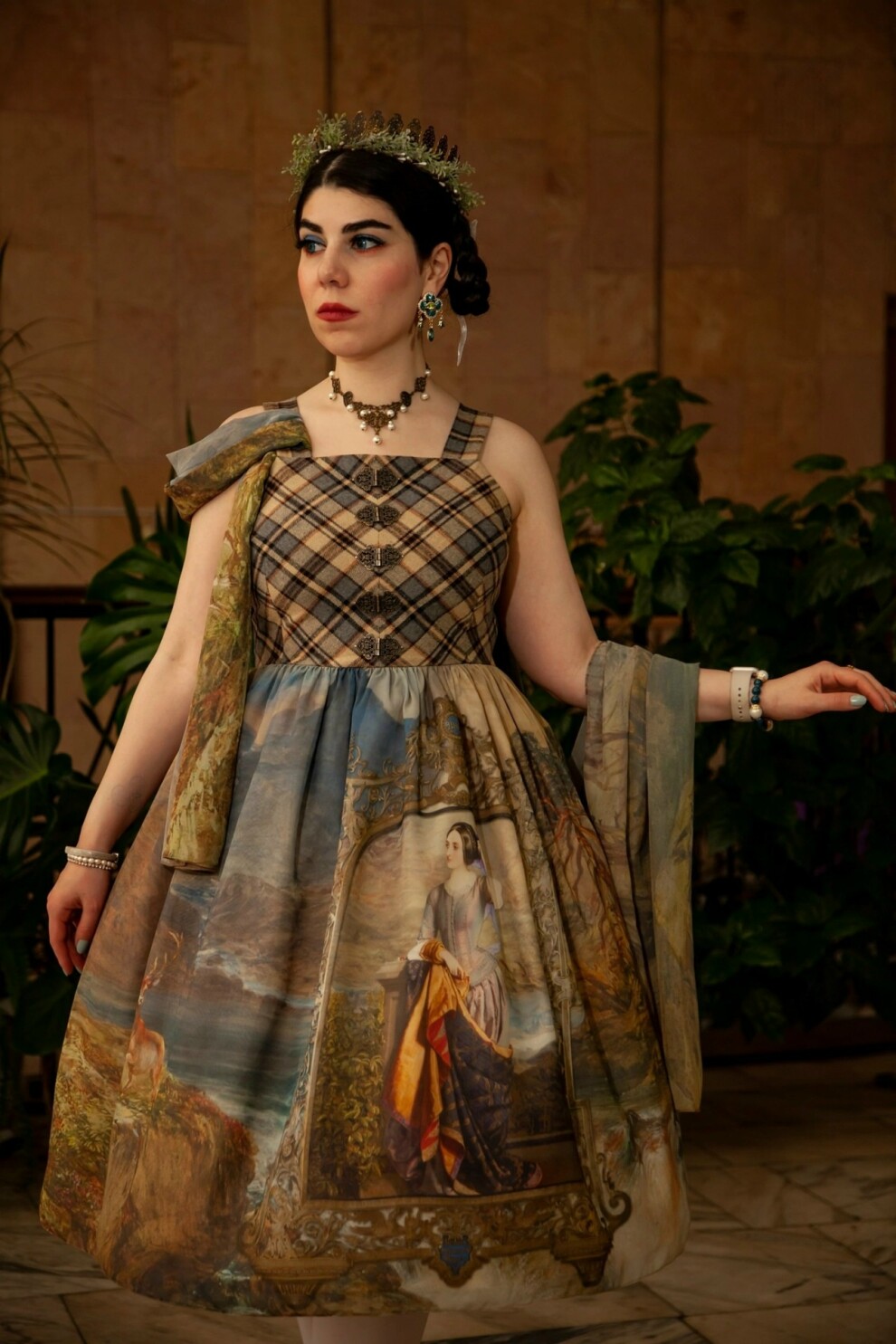 The "Lady Scott" dress from the "Forever May You Reign" collection is a romantic tale of a beautiful woman, embodied in fabric, where the strict checkered bodice meets the airiness of the chiffon skirt, adorned with a portrait of Lady Scott against a Scottish landscape featuring a deer.