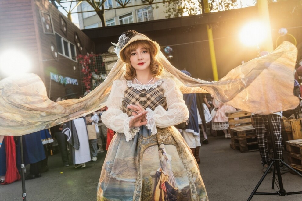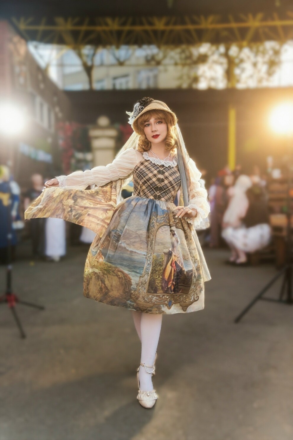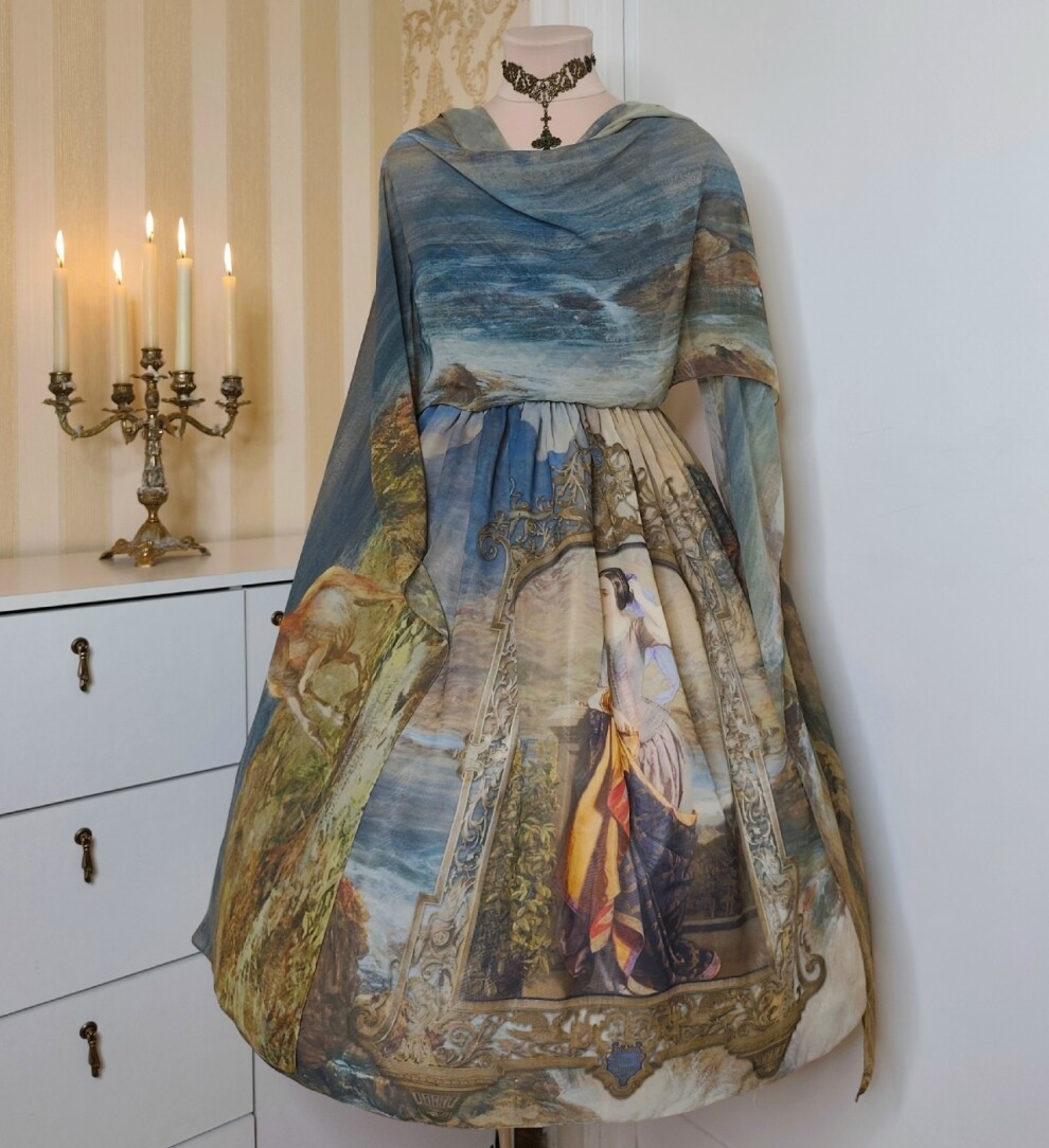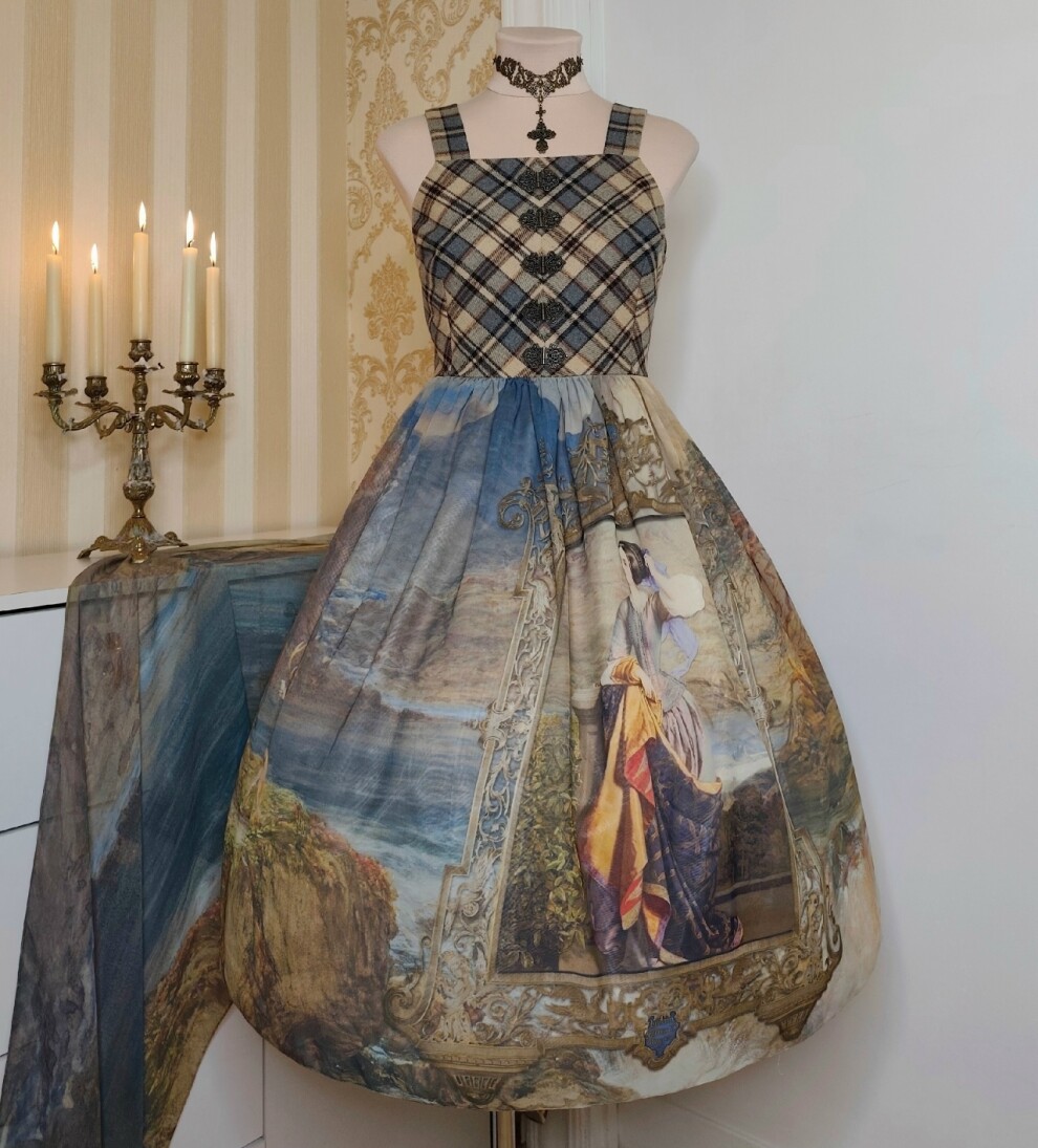 The "Lady Scott" dress from the "Forever May You Reign" collection is a romantic tale of a beautiful woman, embodied in fabric, where the strict checkered bodice meets the airiness of the chiffon skirt, adorned with a portrait of Lady Scott against a Scottish landscape featuring a deer.